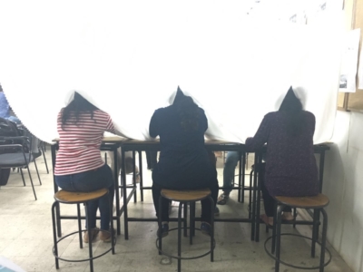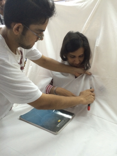 Based on Dutch Eating Designer Marije Vogelzang’s Christmas Dinner, the set up for the experience is simple but effective. We pull up the table linen and suspend it from the ceiling. We carefully create slits for guests to put in their arms and heads. The table cloth covers the guests’ clothing, a major indicator of socio-economic differences. Thus, it acts as an equalizer and creates a faux architectural space.
