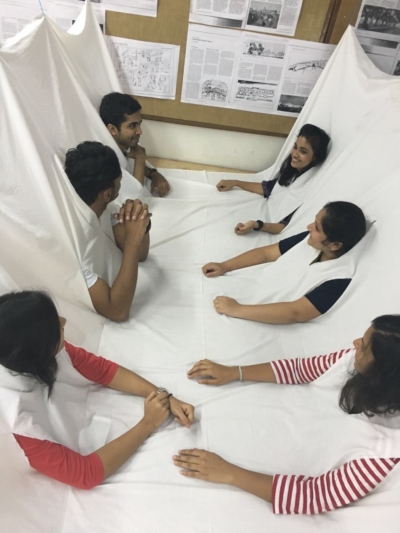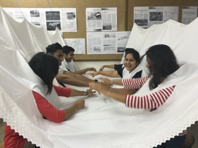 The upturned tablecloth connects diners. One physically feels tiny movements made by another through gentle tugs of cloth. Thus, all the guests are more aware of each other and think about movement. The way we serve the food is also special. We served a traditional local snack, bhel puri. Instead of serving the dish mixed altogether, we presented the different components separately. This encouraged guests to share, reach out and interact with each other while constructing snacks catered to their personal preferences.