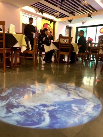 Students worked on creating handmade light installations. A projection of a rotating day-night video of the earth created a void in the centre of the dining room. We played calm but mysterious ambient music and released fragrant mist to transport guests on their way to the dining room. See Floor Plan here. Once seated, we presented guests with origami bento boxes for a sampler menu. We served a set menu, with an option for vegetarian guests and served up a delicious selection of tea and tea-infused cocktails. See Menu Here.